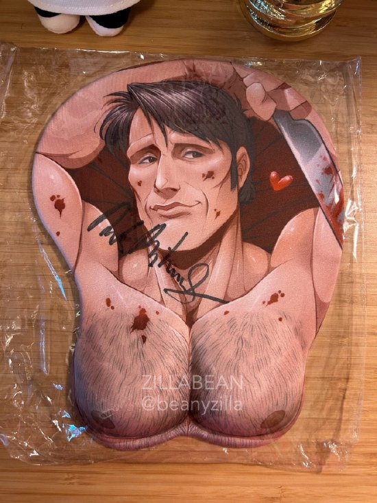 在近期的美国芝加哥动漫及娱乐展览会上,一位“拔叔”麦斯·米科尔森的狂热粉丝想送给拔叔一张以拔叔胸肌为主题设计的鼠标垫作为礼物。尽管最终拔叔没有收下这份礼物,但还是在这张鼠标垫上签名并与其一起拍摄了合影送给了这位粉丝。