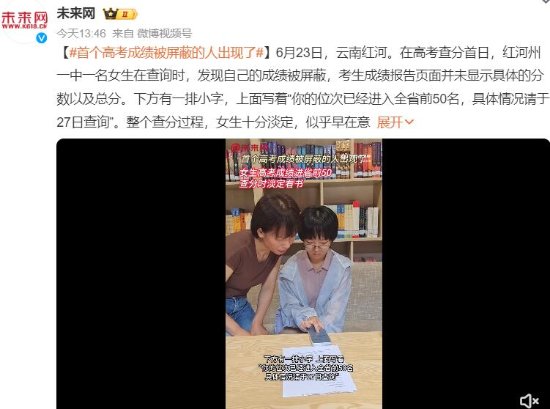 据未来网报道,6月23日,云南红河,在高考查分首日,红河州一中一名女生在查询时,发现自己的成绩被屏蔽,考生成绩报告页面并未显示具体的分数以及总分。