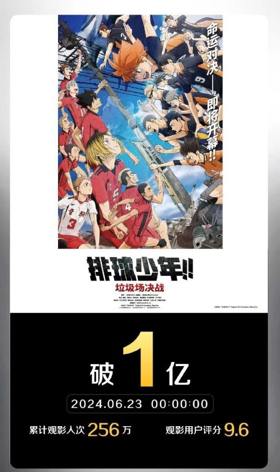 《排球少年》剧场版《排球少年!!垃圾场决战》已于6月15日在各大影院热映,据灯塔专业版实时数据显示,截至6月23日0时0分,《排球少年!!垃圾场决战》票房已突破1亿!