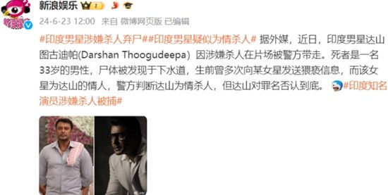 47岁印度演员达山·图古迪帕(Darshan Thoogudeepa)曾出演过60多部电影,并拿下许多大奖。在达山涉嫌杀人案被曝光后,他过往的黑历史也相继被挖出。他在2011年时被妻子指控家暴,称其不但殴打她,还用手枪进行威胁,因此入狱一个月。