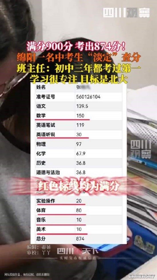 据国内媒体报道称,四川绵阳一学生在满分900分的中考中取得874分的好成绩,仅扣26分。