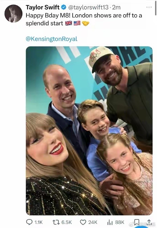 他被拍到在包厢里跟着《Shake It Off》扭动,之后众人合照曝光(没有凯特王妃),霉霉也发文祝威廉王子生日快乐。