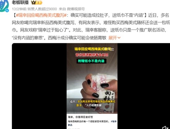 据老板联播报道,近日,多名网友称喝完瑞幸新品西梅美式腹泻,有网友表示,难怪购买西梅美式随杯还会送一包纸巾。