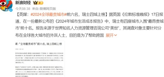 据新浪财经报道,英国《伦敦标准晚报》17日报消息,在一份最新公布的《2024年城市生活成本报告》中,瑞士有四座城市入围“最昂贵城市”前十名。