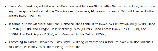 根据市场研究网站Game World Observer发布最新报告显示,《黑神话:悟空》在夏日游戏节公开了最新预告后,游戏Steam愿望单收藏量新增了约85.4万个,超过了6月7日至13日游戏展期间展出的任何其他游戏。报告估算,《黑神话:悟空》愿望单收藏总量已超过400万,其中60%-70%的用户来自中国。