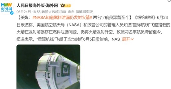 据人民日报海外版报道,近日,美国航空航天局(NASA)和波音公司的管理人员知道“星际航线”飞船搭载的火箭在发射前就存在燃料泄漏问题,仍将火箭发射升空,致使两名宇航员滞留至今。