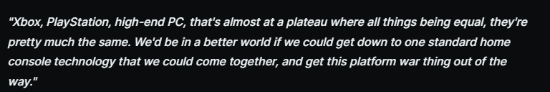 他说:“Xbox、PlayStation和高端PC几乎达到了同等水平。如果我们能够将家用游戏机技术标准化,并将它们结合起来,摆脱平台战争,我们的世界就会变得更美好。”