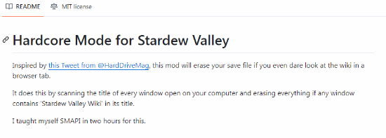 在GitHub上,作者介绍了该Mod实现的原理:它通过扫描用户电脑上当前打开的窗口,来检查标题中是否有“《星露谷物语》Wiki”的字样。如果发现有,Mod就会删除用户的存档。