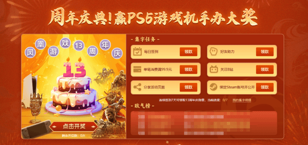 完成指定任务,随机获得字卡,集齐【凤、凰、游、戏、13、周、年、庆】即可参与一次开奖,有机会获得【PS5、Steam Deck、限量手办、3A游戏大作、津贴、P币】等奖品。