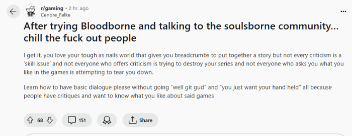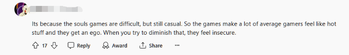 今日,Reddit上一篇有关“魂”系列游戏的讨论贴受到了广泛关注。博主表示:那些遇到反对意见就无脑攻击他人的极端粉丝们破坏了正常的游戏讨论环境。“我只是对你喜欢的游戏提出一些批评,并没有想让它死。”原贴链接