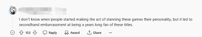 针对他的问题,网友的回复可谓极具攻击性:“‘魂’系列的难度表面看上去非常高,但只需要稍加练习就可以熟练起来。因此,这些游戏能让很多普通玩家感觉自己很厉害,满足他们的虚荣心。当你试图削弱这种自负感时,他们就会急眼。”实际上不只是‘魂系列’,有不少其他游戏的讨论环境里同样存在着这样的“极端粉丝”。如果你对游戏进行批评,就会被他们以“你根本不懂这个游戏!”等理由进行攻击,甚至会被扣上“云玩家”的帽子。