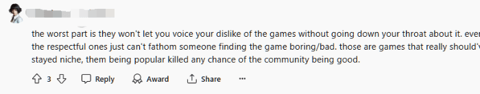 评论区的各位纷纷表示赞同。有网友同样抱怨自己所遇到的情况:“不知道从什么时候开始,人们开始把喜欢‘魂系列’游戏当做了个性。”“他们不让你对游戏进行批评,这类游戏果然还是保持小众比较好。”