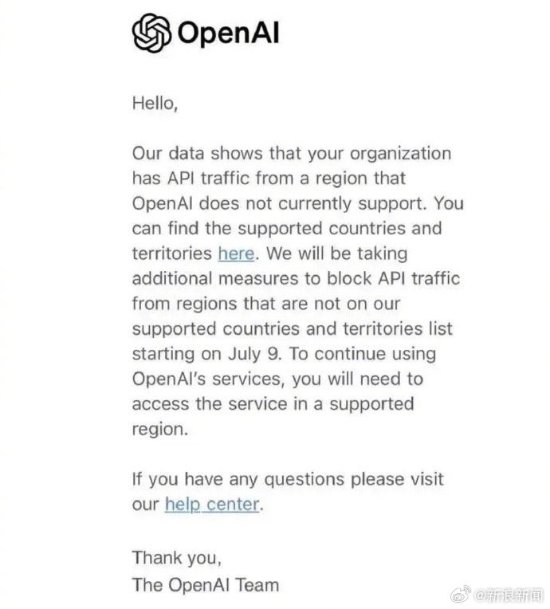 OpenAI官宣:将终止对中国提供API服务!