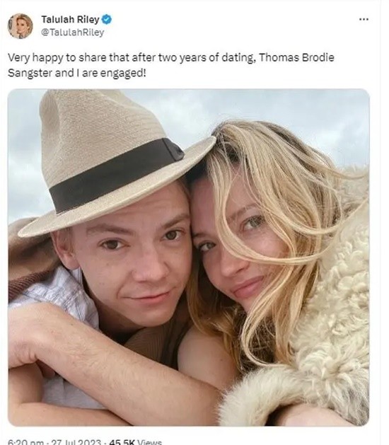 托马斯·布罗迪-桑斯特和妲露拉·莱莉这场相差4岁的姐弟恋,始于剧集《叛逆之声》,二人与2023年夏天宣布订婚,当时马斯克还在Twitter(现名为:X)上为前妻送上祝福。
