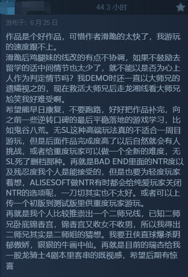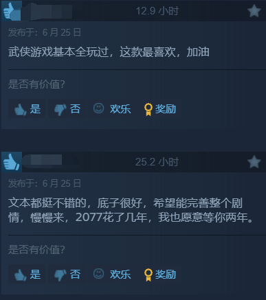 有玩家表示作品实际上是好的,希望《活侠传》官方能向之前一些逆转口碑的游戏学习。也有玩家对《活侠传》官方进行了鼓励,并表示《赛博朋克2077》的首发状况也不尽人意,但CDPR在花了几年的时间后,最终将游戏的口碑进行逆转,玩家自己也愿意等《活侠传》几年。
