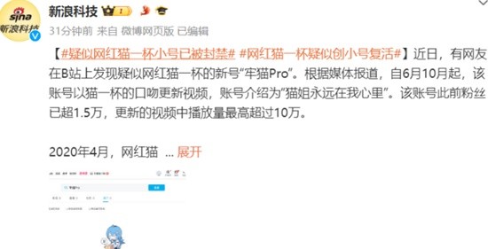 网红猫一杯疑似创小号"牢猫Pro"复活 目前已被封禁