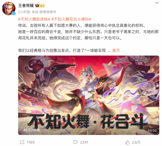 《王者荣耀》宣布将推出SNK官方授权的不知火舞“花合斗”皮肤。