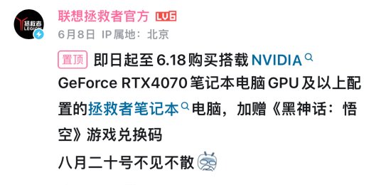 之前,联想确实推出了购买拯救者笔记本送《黑神话:悟空》游戏兑换码的活动,在活动时间内购买RTX 4070以及以上配置的拯救者笔记本,即可获赠《黑神话:悟空》游戏兑换码。