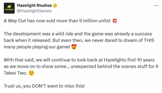 今日,《双人成行》开发商Hazelight Studios发文称,自2018年在PS4、Xbox One和PC平台发行以来,其工作室首款作品《逃出生天》销量已超过900万份!