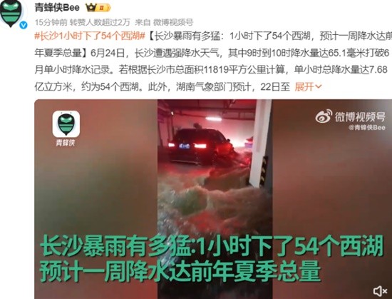 据青蜂侠Bee报道,6月24日,长沙遭遇强降水天气,其中9时到10时降水量达65.1毫米打破6月单小时降水记录。