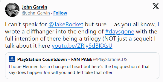 近日,《往日不再》开发商Bend Studio前游戏总监John Garvin透露,该作最初是有制作三部曲计划的。