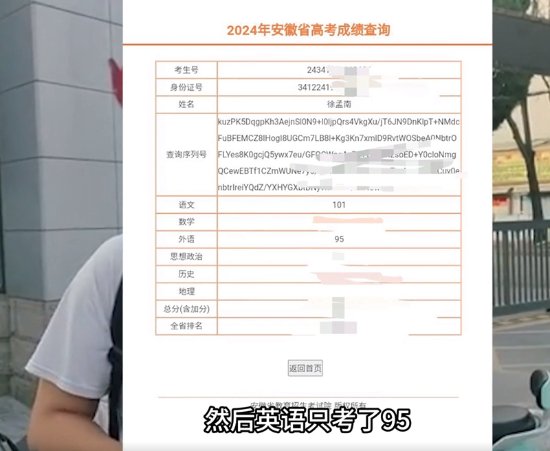 6月25日,2024安徽高考成绩发布,徐孟南公开自己的语文成绩为101分,英语成绩为95分。虽然两科成绩相对稳定,但他本人表示,这一结果与自己的预期存在较大差距,特别是在英语科目上,投入较多时间准备却未达理想分数,让他感到有些失落。