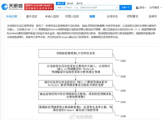 摘要显示,该专利方法包括:获取院校数据集L中的学校名称;以各院校近四年的录取分数线作为输入,分别对各院校录取分数线进行预测;通过后验差法对各院校的预测结果进行检验并择优选择;输出各院校所对应的预测录取分数线,得到院校预测录取分数线数据集D;根据院校预测录取分数线数据集D、应届考生高考分数,利用改进的K‑means算法进行院校推荐,准确率高且推荐信息全面。