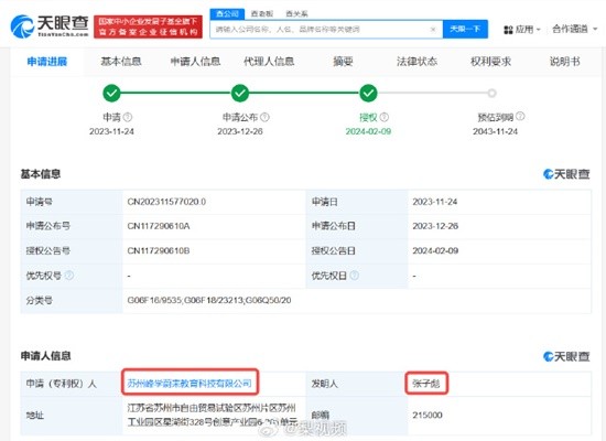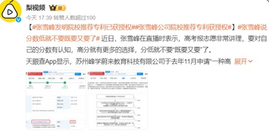 此外,据国家企业信用信息公示系统显示,苏州峰学蔚来教育科技有限公司于去年11月申请“一种高校招生信息推荐方法和系统”专利,该专利已于今年2月获授权,其发明人为该公司执行董事、控股股东张子彪(张雪峰)。