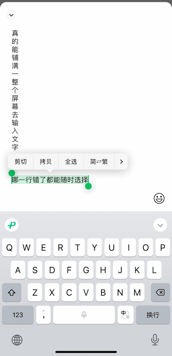 在聊天输入框中输入到第三行字时,点击左侧向上箭头,或者长按聊天输入框,在弹出选项中选择“全屏输入”。即刻拥有爽感十足的输入体验,剪切、复制也更加方便了。