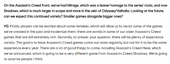 “首先,玩家会对一些重制版感到兴奋,这将使我们能够重新审视我们过去创作的一些游戏,并使它们现代化;我们的一些老版《刺客信条》游戏中的世界仍然非常丰富。”