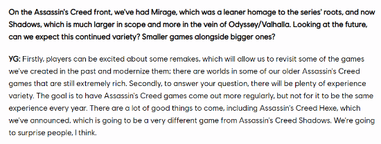 当谈到育碧未来项目时,他表示:“首先,玩家会对一些重制版感到兴奋,这将使我们能够重新审视我们过去创作的一些游戏,并使它们现代化;一些老版《刺客信条》游戏中的世界仍然非常丰富。”