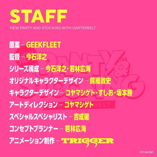 7月4日晚, TRIGGER也正式公布新作动画标题为《新吊带袜天使》(New PANTY&STOCKING with GARTERBELT),同时也公布了制作团队名单与前导视觉图,目前开播日期尚未公布。