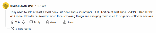 “我通常会为《勇者斗恶龙》游戏购买典藏版,但这次的价格太荒谬了,如果它与《勇者斗恶龙1+2》或者其他的东西捆绑在一起售卖,那我有可能会考虑它,而且我也无法忍受一堆亚克力块和一个典藏外箱的价格,这些东西可能会在运输的同时被损坏。”