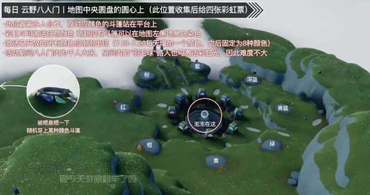 2、泡泡出现的位置如下图所示,地图中央的大泡泡是固定出现的,需要多人合作穿着对应颜色的斗篷站在平台上激活彩虹才能获取,大泡泡收集可以获得4张彩虹票;