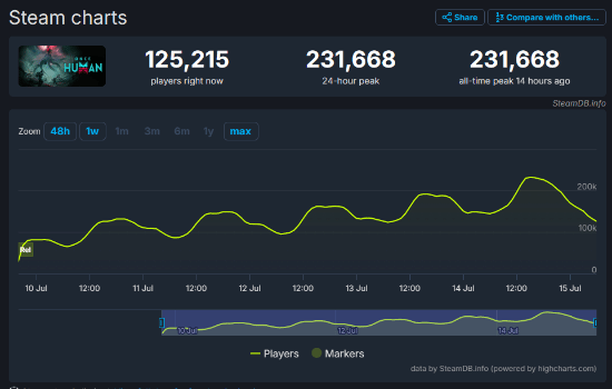 SteamDB数据显示,网易免费开放世界生存游戏《七日世界》Steam在线峰值已突破23万人,相比首发时的13万人又增加了10万人,火爆程度可见一斑。