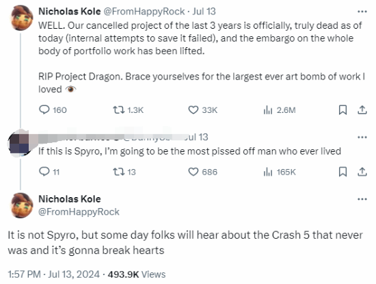 开发商Toys For Bob设计师Nicholas Kole确认,《古惑狼5》和工作室新IP《Project Dragon》已被取消。