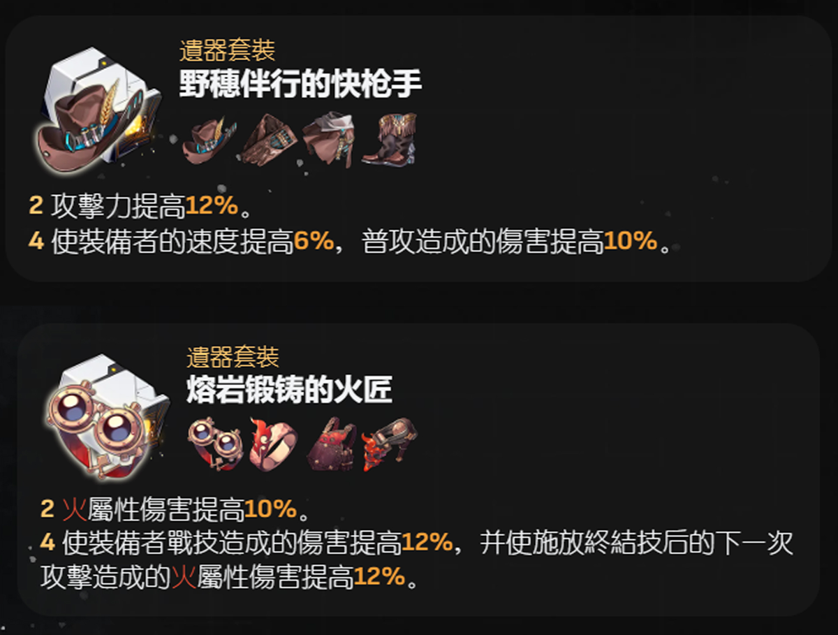 后期换成火匠四件套。它可以使战技伤害提高,并且用终结技后,下一次的火属性攻击,伤害也会提高,非常匹配虎克的技能。
