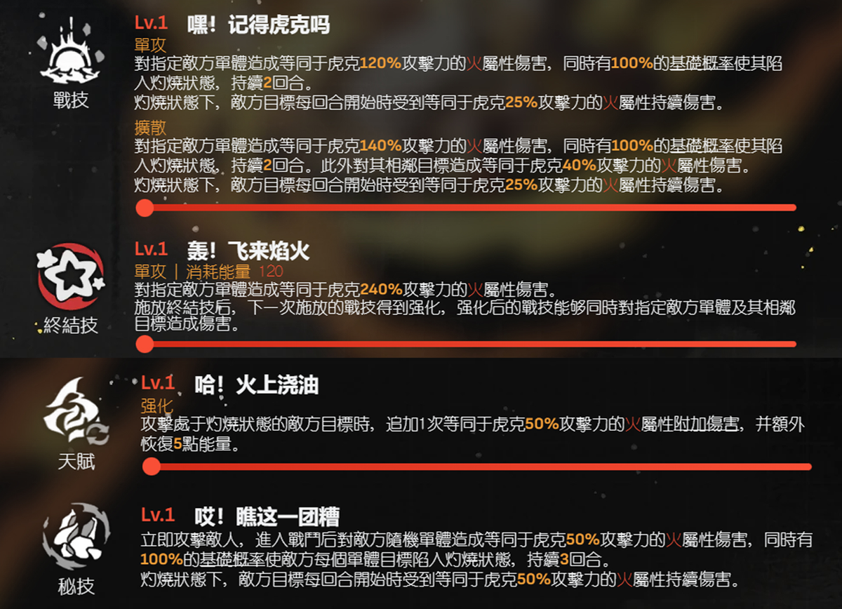虎克是一名火属性的「毁灭」命途角色,虎克在攻击处于灼烧状态下的敌人时会有附加伤害并回复能量,使用战技可以对单个敌人造成火属性伤害并有概率使其陷入灼烧状态;使用终结技可以对敌方单体造成高额火属性伤害并使下一次战技变为扩散攻击;使用秘技可以在进入战斗后对敌方全体造成火属性伤害并有概率令敌人陷入灼烧状态。