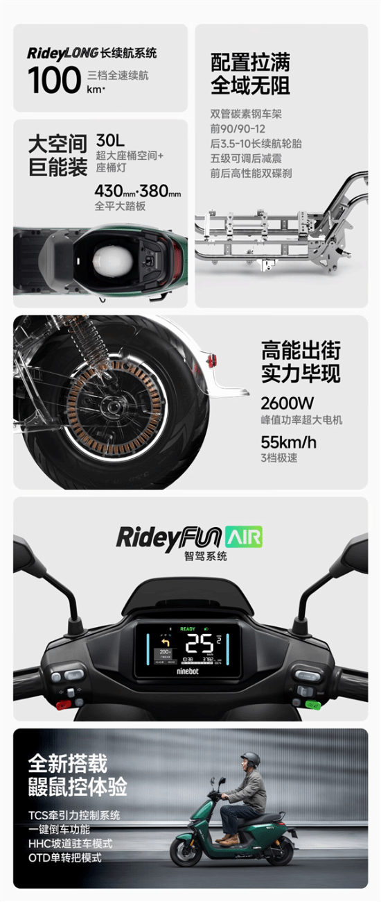 核心配置方面,九号远航家M95电动摩托车采用双管碳素钢车架、标配前后碟刹与五级可调式后减震,提供30L坐桶空间,并搭载峰值功率2600W电机与72V 32Ah铅酸电池。