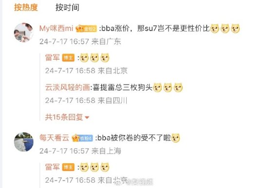 有网友在评论区表示: “bba被你卷的受不了啦!”还有网友表示BBA涨价,“(小米)SU7岂不是更(具)性价比。”随后,雷军回复数个狗头三连。