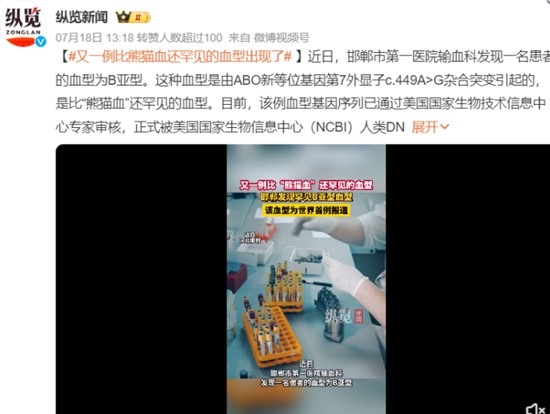 据纵览新闻报道,近日,邯郸市第一医院输血科发现一名患者的血型为B亚型。