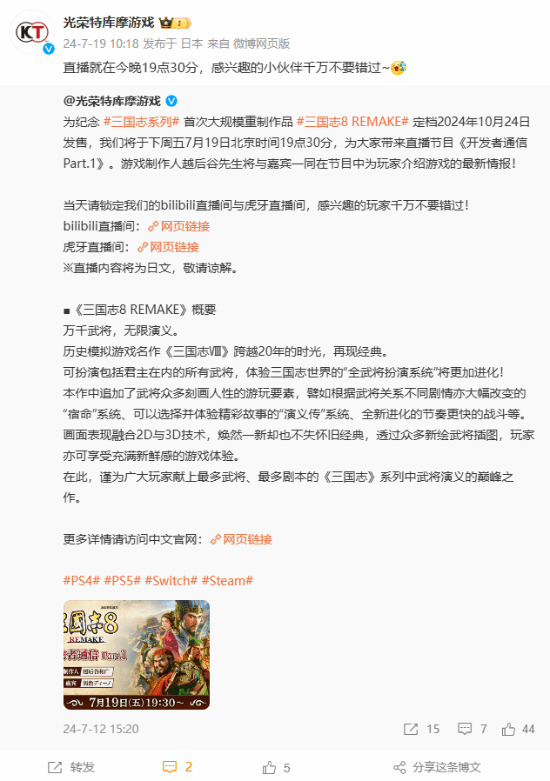 今晚7点半!《三国志8RE》官方将公开游戏最新情报