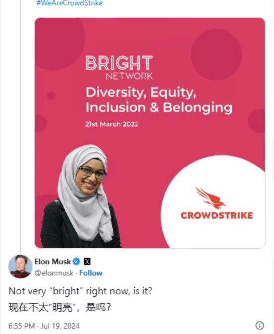 马斯克一向对 DEI 持批评态度,曾公开表示其不过是“种族主义的另一种说法”。此次,他回复 CrowdStrike 2022 年的一条关于与 Bright Network 合作推进 DEI 的推文,讽刺道:“现在看起来不太‘明亮’啊。”似乎暗示此次故障与 CrowdStrike 的 DEI 倡议有关。