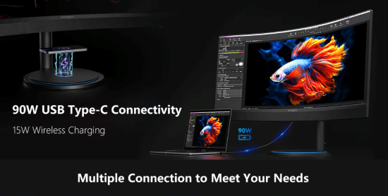 此外,这款显示器底座还自带15W无线充电器,支持90W USB-C反向供电与USB Hub功能,自带升降旋转支架。