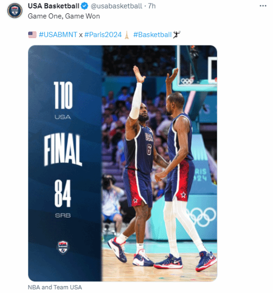 在昨晚的奥运会男篮小组赛上,美国队110-84大胜约基奇领衔的塞尔维亚。