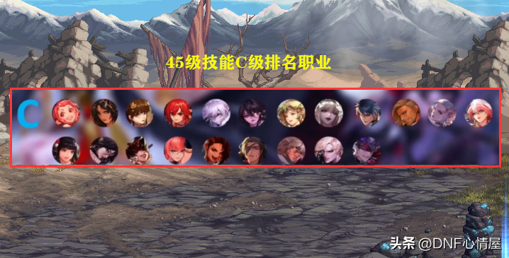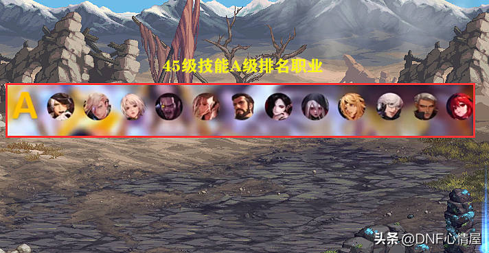 【45级技能A级排名职业】:包含男弹药、合金战士、剑宗、复仇者、剑魂、蓝拳、猩红法师、暗帝、女大枪、男机械、特工和召唤师。A级45级技能排名,要比S级差劲些,但这些职业也表现的挺好的。
