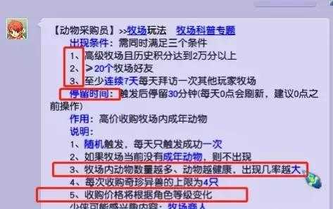 1.加好友。点击牧场管理员,会有一个会话框,点击面板上的“牧场告示牌”,在上面右击别人的昵称,选择加好友(加好友的时候,尽量加那种类似于五开的名字)。也就苦这一次,加他40个不嫌多。(触发牧场守护兽和来牧场收购商最少需要30个好友)只需要辛苦这么一次,加好友尽量加那种类似五开的名字。
