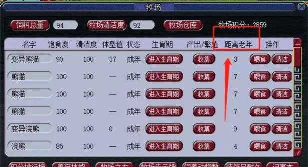 哺乳类-树袋熊 从养的时候一直到一直到距老年还有5天这期间饱食度80(繁殖的情况,如果不繁殖只收产物和买窝,可以一直维持不低于71),其他天数保持最低72饱食度即可。具体怎么看距老年,仔细看图,后面有图(点箭头指向的地方,会有切换距离老年和剩余寿命,点一下即可切换)