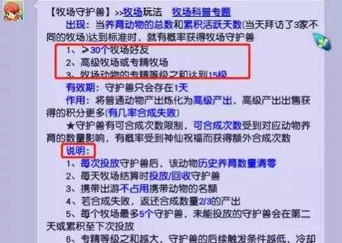 3.牧场守护兽。当玩家达到高级牧场或专精牧场,且牧场动物的专精等级之和达到15级,会开启守护兽玩法。开启玩法后,若当天拜访了3家不同的牧场且拥有30个以上牧场之友,则可以积累一天活跃天数。当养育动物的总数和累积活跃天数达到标准时,就有概率获得牧场守护兽。通过守护兽可以将普通动物产出炼化为高级产出,高级产出出售获得的积分更多。炼化有一定概率失败,如果失败则返回部分动物产出。特别说明:守护兽有可合成次数限制,可合成次数受到对应动物养育的数量影响,有概率受到神仙祝福而获得额外合成次数。