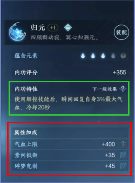 在逆水寒手游的内功系统中可以看到,每个内功都会有一个内功特性(绿色框内),也就是这个内功的附带技能,会随着等级提升强化效果。